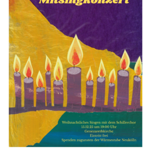 12. Dezember 2025 · 19:00 Uhr · Genezarethkirche (Herrfurthplatz) Am 12. Dezember verwandelt sich die Genezarethkirche in einen Ort voller Klang, Farbe und Solidarität. Unter dem Motto „Wärme schenken!“ laden wir zu einem besonderen Benefizkonzert zugunsten der Tee- und Wärmestube ein – einem wichtigen Zufluchtsort für Menschen ohne Wohnung in unserem Kiez. Mit dabei sind […]