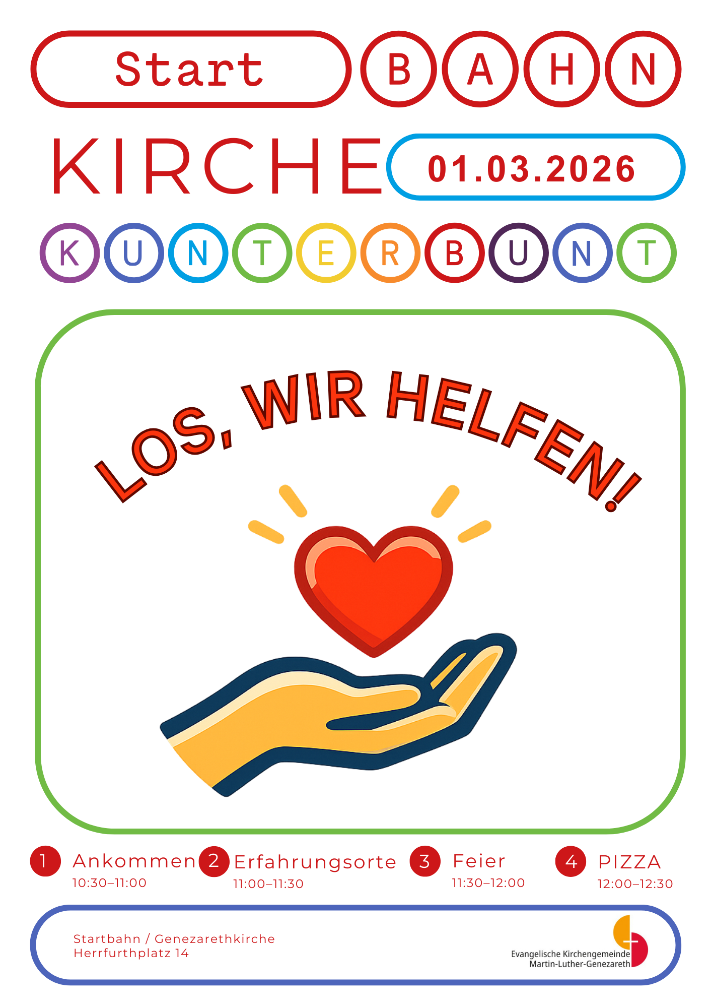 Die Kirche Kunterbunt ist ein Gemeinschaftsprojekt von STARTBAHN, Segensbüro, der Familienbildung des Evangelischen Kirchenkreises Neukölln und der Martin-Luther-Genezarethgemeinde.