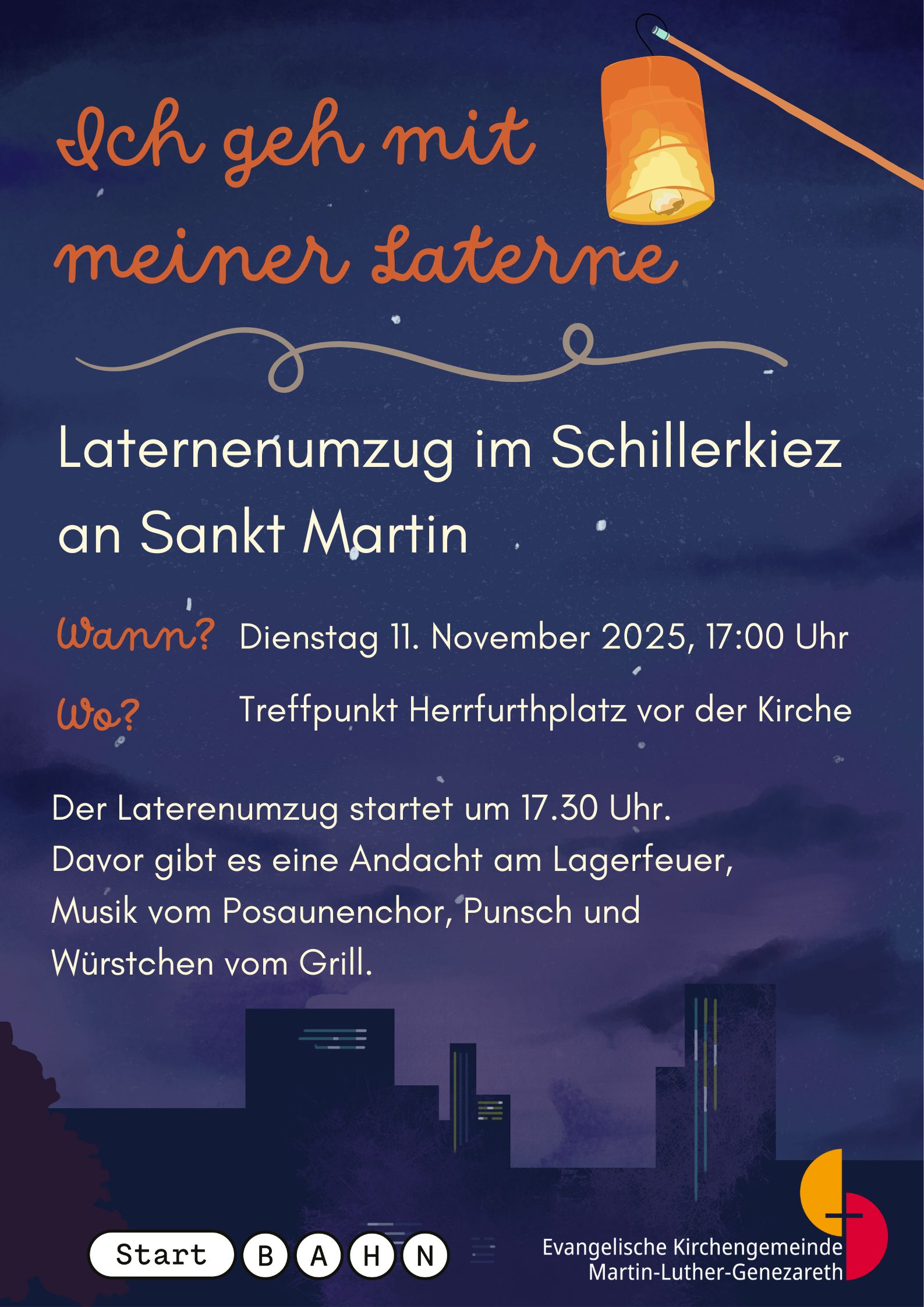 Am 7. November um 17 Uhr laden wir herzlich zum Martinsfest auf dem Herrfurthplatz ein. In der frühen Dunkelheit sammeln sich Kinder und Erwachsene mit ihren bunten Laternen rund um ein kleines Lagerfeuer vor der Genezarethkirche.