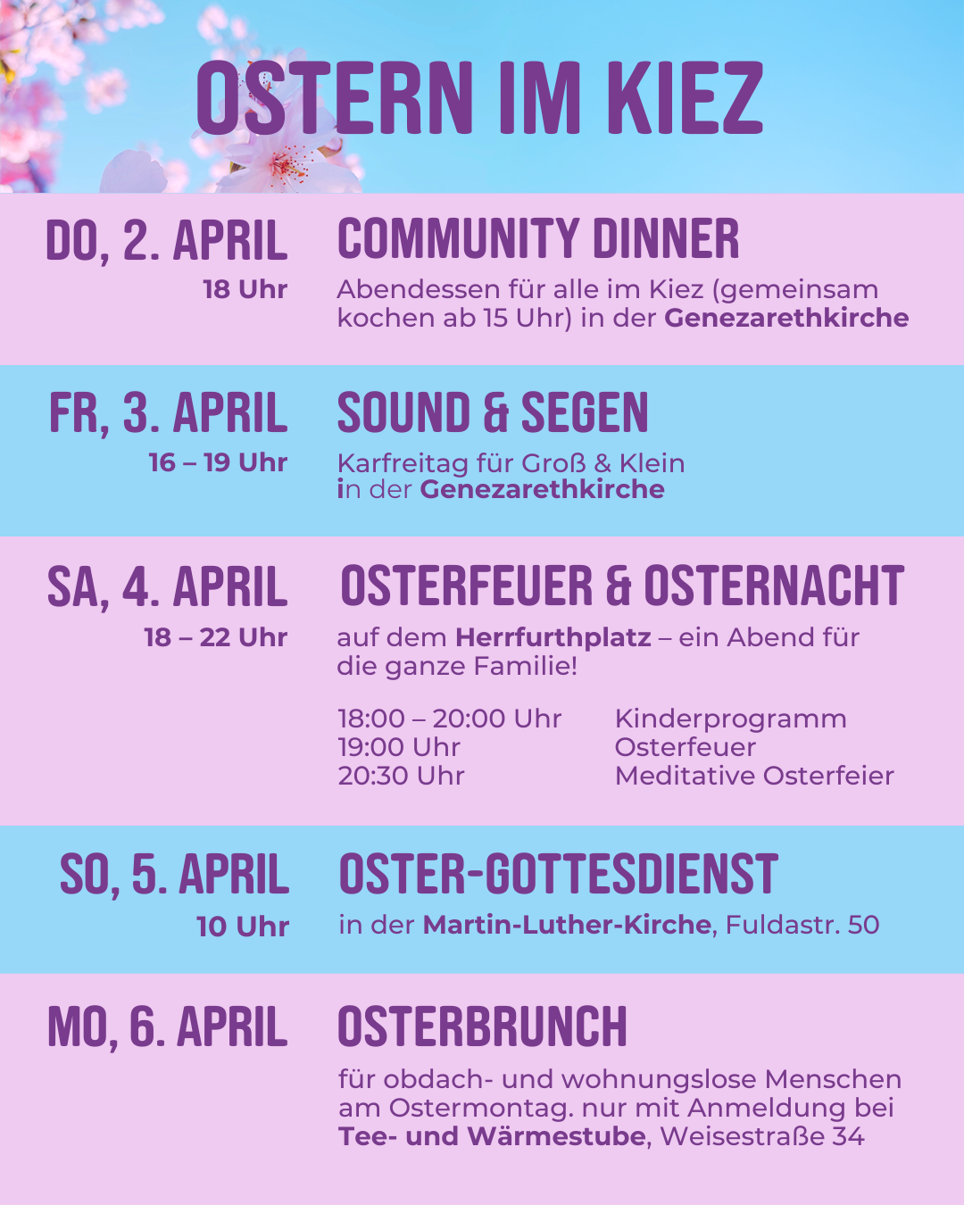 Am 4. April von 18 bis 22 Uhr feiern wir auf dem Herrfurthplatz Osterfeuer & Osternacht. Der Abend beginnt mit einem offenen Programm für Familien – mit kleinen Aktionen, Essen und Begegnung. Um 19 Uhr wird das Osterfeuer entzündet. Um 20:30 Uhr beginnt in der Kirche die meditative Osternacht – ein stiller Weg vom Dunkel ins Licht, getragen von Musik und Texten.